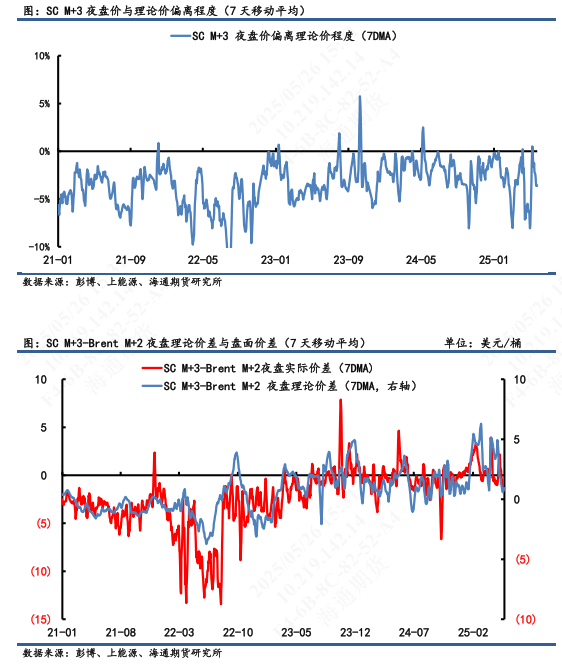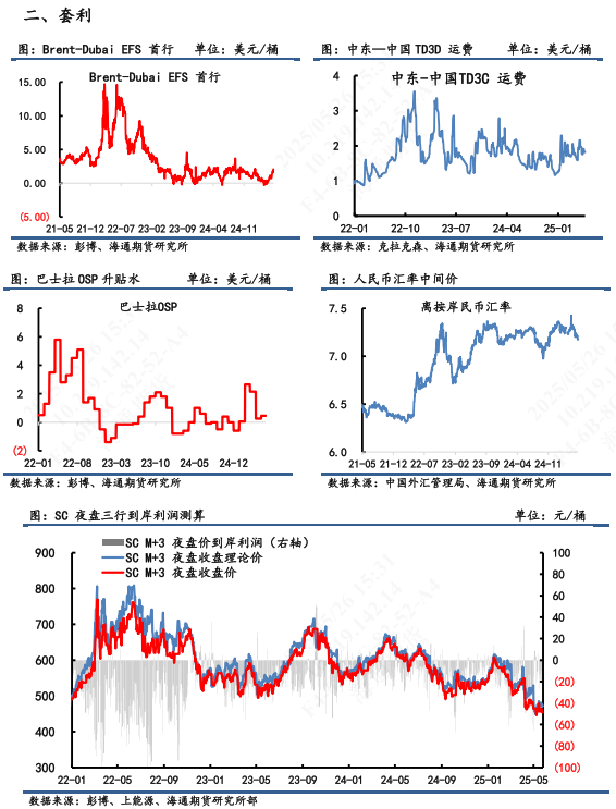 2)套利:①估值:5月23日凌晨2:30,Brent 2507盘面价为64.46美元/桶,SC 2508盘面价为453.8元/桶,测算SC 2508盘面理论价为469.8元/桶,盘面估值偏离程度-3.41%。②利润:测算SC2508盘面到岸利润-16.01元/桶,折合-2.23美元/桶。③价差:SC2508-Brent2507盘面差为-1.19美元/桶,理论差1.04美元/桶,盘面价差低于理论价差。(注:本周Brent首行为2507;SC首行为2507;其中M代表时下5月)