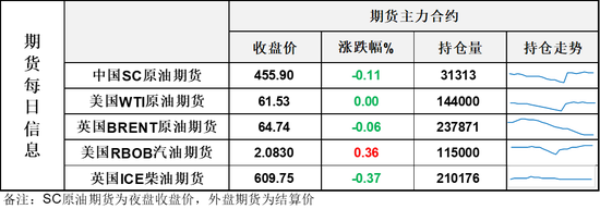 【1】WTI主力原油期货收跌0美元,跌幅0%,报61.53美元/桶;布伦特主力原油期货收跌0.04美元,跌幅0.06%,报64.74美元/桶;INE原油期货收跌0.11%,报455.9元。